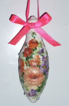 6. После того, как все фрагменты наклеены, даём лампочке хорошенько просохнуть и покрываем её двумя слоями акрилового лака. Когда лак высохнет, можно лампочку дополнительно украсить – приклеить стразы, выделить тычинки и серединки цветов перламутровыми контурами различных оттенков, можно дополнительно покрыть всю поверхность или отдельные её участки лаком с блёстками.