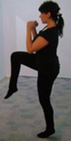 Встаньте, руки положите за голову. Далее – глубокое приседание, встаем и делаем мах ногой вперед перед собой. Чередуя ноги, сделайте в общей сложности 16-29 раз.