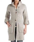 Короткое вязаное пальто – символ женственности. Цветные горизонтальные полосы подчеркивают спортивный стиль этого изделия. Акцент сделан на карманы и большие пуговицы.