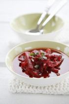 Минут за 5-7 до готовности добавить сваренную и натёртую на тёрке свеклу и измельчённый чеснок.