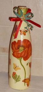 4. После того, как все фрагменты наклеены, даём бутылке хорошенько просохнуть и покрываем её двумя слоями акрилового лака. Когда лак высохнет, можно бутылку дополнительно украсить – приклеить стразы, выделить тычинки и серединки цветов перламутровыми контурами различных оттенков, бабочкам дорисовать усики, а горлышко бутылки украсить точками, нарисованными с помощью ватной палочки или теми же контурами различных оттенков.