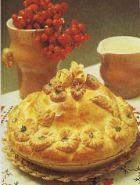 …Чтобы выстроить грандиозную «шапку» курника, готовят две лепешки из теста, одна из которых примерно в два раза меньше другой. Маленькую лепешку кладут на сковороду, на неё укладывают слои начинки, перемежая их «блинчиками». На большой лепешке от краев к центру делают несколько надрезов (традиционно – восемь). Этой лепешкой закрывают выстроенную «пирамиду» из нескольких слоёв начинки и защипывают её по разрезам и по окружности – в местах соединения с нижней лепешкой. А затем все это сооружение украшают орнаментом из теста, смазывают яйцом и выпекают.