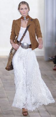 Тогда в моду вошли широкие юбки и блузы из легких тонких тканей с цветными принтами, очень длинные тонкие шарфы (которые повязывали в том числе и вокруг головы), бахрома, шнуровки, национальные рисунки.
