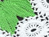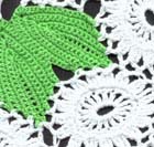 Для вязания топа использовано около 300 г хлопковой пряжи «Лилия» МШФ, 392 м/100 г двух цветов, крючок 2.0. Для модели связано 63 листика (схема 1), которые разложены по выкройкам переда и спинки (используйте фото или придумайте свой вариант), соприкасающиеся части листиков сшиты иголкой с зеленой ниткой. Оставшееся пространство заполнено ромашками (схема 2) которые прикрепляются к уже готовому полотну во время выполнения последнего ряда мотива, средняя петля дуги заменяется на ст б/н или ст с 1Н присоединения к готовому элементу (краю листа или дуге ромашки). Боковых и плечевых швов нет, соединение переда и спинки делается во время присоединения очередных мотивов.