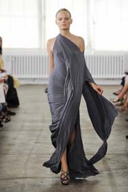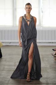 На показе Donna Karan на подиум вышли античные богини в изысканных и лаконичных нарядах. Жемчужно-серые туники с металлическим блеском можно взять на вооружение для светского летнего выхода. Изящные греческие сандалии снабжены каблуками, головки гладко причесаны, серебристые украшения выглядят весьма внушительно, как дань главному тренду 2011 года.