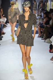 Если коллекция Dolce&Gabbana пропагандирует цветочный рисунок и клетку, то Diane von Furstenberg – полоску и леопардовые принты. Кокетливые кепи и козырьки, широкие атласные ленты на обуви и объемные сумки, мини-комбинезоны и контрастные оттенки – перед нами дерзкие и загадочные девушки на отдыхе от Diane von Furstenberg.