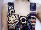 Сверху нашить один из вязаных цветов, оформить стразами.