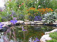 Ландшафтный водоем лучше сделать свободной формы. По берегам оформить его природными камнями. Растения в этом случае подбираются попроще, в основном лиственные: многолетние травянистые или кустарники со свисающими побегами, высокие декоративные злаковые травы, а также дикие виды, которые в природе растут у водоемов. Это может быть, например, кремово-белый или розовый лабазник, аквилегия, василисник, лилейник. Близко к краю пруда хорошо посадить калужницу болотную, незабудку болотную, ирис сибирский, вербейник монетчатый. Все они хорошо оформляют границу водоема.