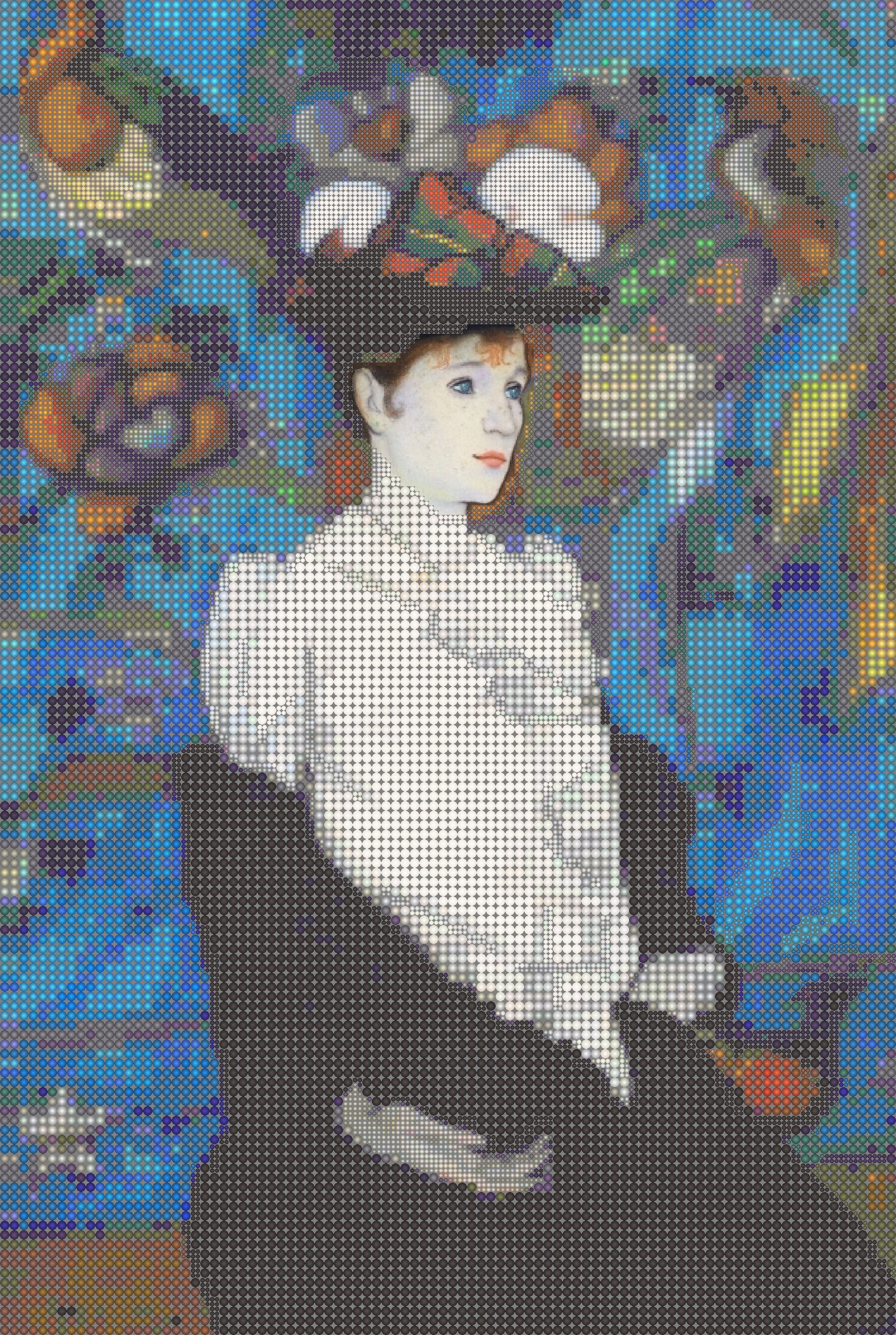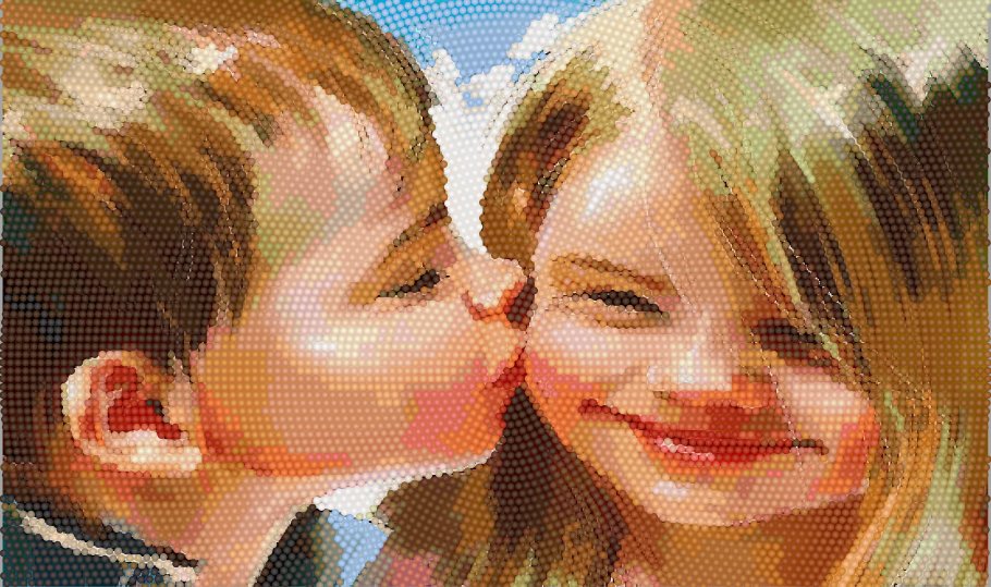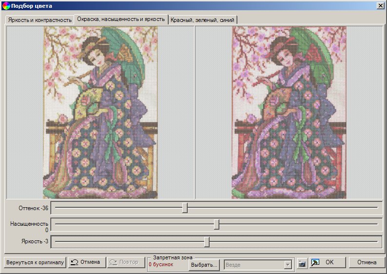 В принципе этого же можно достичь с помощью Фотошопа путем предварительного применения аналогичного цветового преобразования исходного изображения (фото). Но это только в принципе. Дело тут в следующем. Фотошоп очень хорошо выполняет различные цветовые преобразования, но при этом действует во всем пространстве возможных цветов. Нас же интересует только используемая палитра цветов бисера или мулине — Preciosa, Toho, ПНК им. Кирова и т.д. Например, с помощью Фотошопа была откорректирована цветовая гамма фотографии, и в некоторых ее местах был установлен цвет с RGB кодом (250, 60, 192). Но в используемой палитре бисера Preciosa может не оказаться точно такого же цвета. И подборе цвета из имеющихся в палитре нашей программой будет использован наиболее близкий цвет с другим RGB кодом, например, (240, 70, 180); и так для многих цветов. Т.е. построенное “удачное” цветовое преобразование Фотошопа будет почти наверняка искажено. Причем увидим мы это только после работы в Фотошопе, загрузки откорректированной фотографии в нашу программу и создания вышивки. Получив неудачное с художественной точки зрения цветовое преобразование вышивки, мы будем вынужденно заново корректировать в Фотошопе фотографию, снова загружать ее в нашу программу, создавать схему вышивки и анализировать ее. Таких итераций придется сделать, скорее всего, очень много. А наша программа сразу работает в цветовом пространстве выбранной палитры бисера Preciosa, показывая полученный результат (правая картинка на рисунке выше) и предоставляя возможность сравнить его с начальным вариантом (левая картинка на рисунке выше).