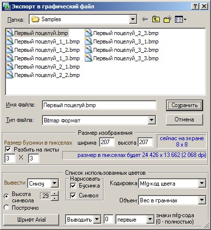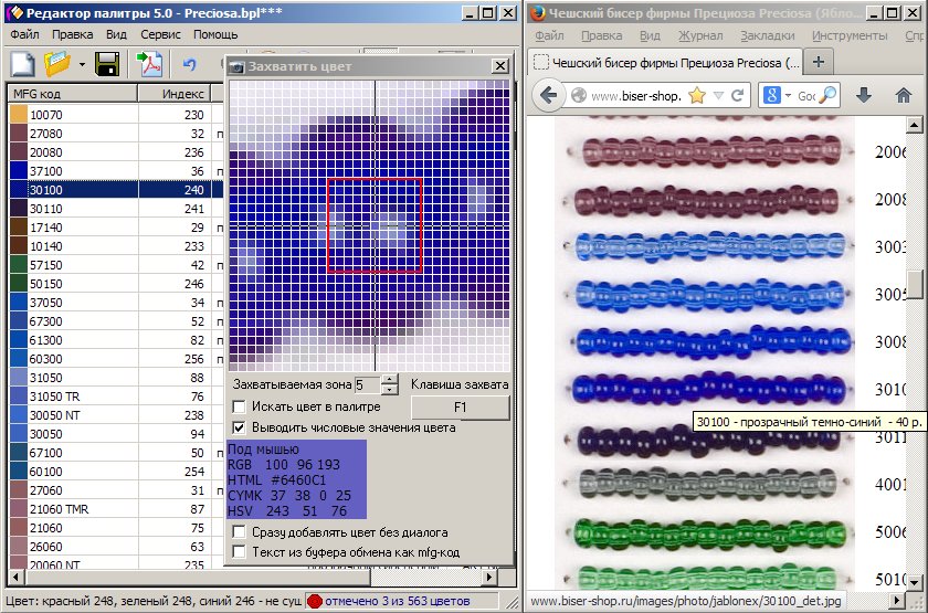 7. Десятки стандартных палитр бисера (Preciosa, Toho,…) и мулине (Гамма, ПНК им. Кирова, Dmc, Anchor). Возможность создания собственной палитры путем захвата с монитора RGB кодов компьютерных изображений бусин или мулине
