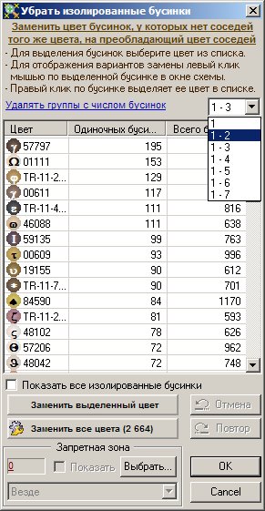 10. Удаление изолированных бусинок (крестиков) — простое и эффективное средство поиска, отображения и удаления отдельных изолированных бусинок или стежков, как в автоматическом режиме, так и в режиме ручного выбора вариантов замены цвета: