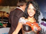 Из одежды на девушке присутствовали лишь миниатюрные трусики, а на животе красовался логотип MTV, ради которого, незадолго до церемонии над её телом усердно работали мастера боди-арта.