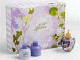 Описываемый как "аромат признаний в любви", набор Lolita Lempicka помещен в коробочку свежих розово-лиловых цветов (на фото). В набор входят парфюмированная вода (50 мл) и маленькие флакончики парфюмированного геля для душа и парфюмированного бархатного крема.