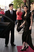 Пред публикой красавица предстала в роскошном чёрном длинном платье – с накидкой и декольте. Наряд актрисы был дополнен серьгами с зелёным камнем, толстым браслетом и кольцом, что гармонировали с её серьгами.