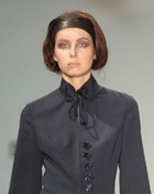 Макияж моделей в коричневых тонах выгодно гармонировал с цветом коллекции. Приглушенные оттенки темно-синего, пыльно-голубого, серо-бежевого, цвет антрацита и древесной коры. Тончайший черный шифон, наслаиваясь на блеск свинцового крепсатена, подчеркивал матовость серой шерсти. Рисунки, напоминающие детали гравюр второй половины XVIII и барочный орнамент в белом варианте напомнили о богатом культурном наследии родного города Татьяны Парфеновой.