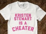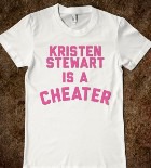 Один из виртуальных магазинов Skreened решил, что можно поживиться на истории с изменой Кристен Стюарт. Он выпустил коллекцию футболок и написал на них обидные для знаменитости слова: «Кристен Стюарт обманщица», «Кристен Стюарт трампир» и многие другие.