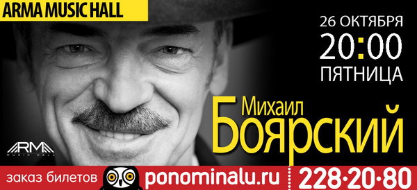 В преддверии праздника хэллоуин, 26 октября, Вы сможете услышать так давно полюбившиеся мелодии. Живой концерт Михаила Сергеевича Боярского, начнется в 20:00, в стенах Arma Music Hall.