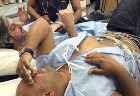 Желающих нашлось всего лишь двое. Им к разным точкам живота и грудной клетки присоединили электроды для симуляции тех ощущений, которые испытывают женщины во время схваток.