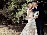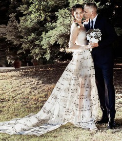 «Свадебный наряд невесты не простой, а со смыслом, - сказал один из представителей Валентино. - Это не просто ноты на подоле платья – это любимая песня Эроса Рамазотти и его любимой Las Cosas de La Vida. Над платьем трудились директора бренда Мария Грация Киури и Пьерпаоло Пичолли».