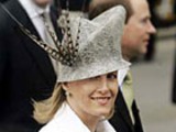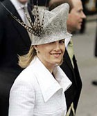 Герцогиня Уэссекская, никогда не отличавшаяся особой приверженностью традициям, продемонстрировав одну из своих знаменитых асимметричных шляп с эффектом змеиной кожи.