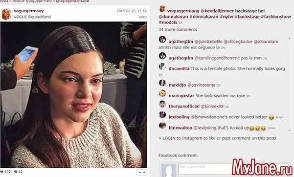Модель Бинкс Уолтон прокомментировала снимок Кендалл: «That’s f*cked up» (непереводимая игра слов). Лекси Болинг отметила: «Она никогда не выглядела лучше» и добавила смеющийся смайлик.