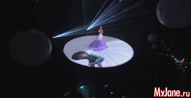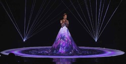Вначале зрители думали, что платье самое обычное. Однако затем платье окрашивалось в разные цвета при помощи видеопроекции. Также на наряде появлялись кадры из мультфильма.