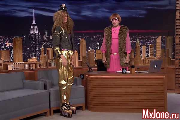 Ее голову украшали пышные кудряшки, а костюм был просто невероятный! Кстати, Джимми сам выбрал образ для знаменитой актрисы. Впрочем, еще можно поспорить, кто был одет более странно – Терон или Фэллон…