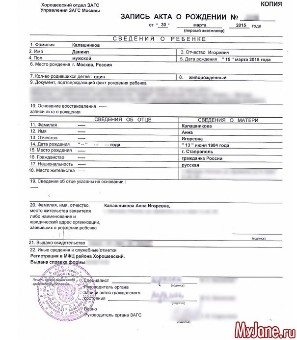Двухмесячный малыш в свидетельстве о рождении записан как Калашников Даниил Игоревич. В графе «отец» мы видим прочерк. Анна Калашникова в документе фигурирует как мать-одиночка. Поэтому вполне естественно, что мальчик получил фамилию и отчество такие же, как у единственной родительницы – мамы.