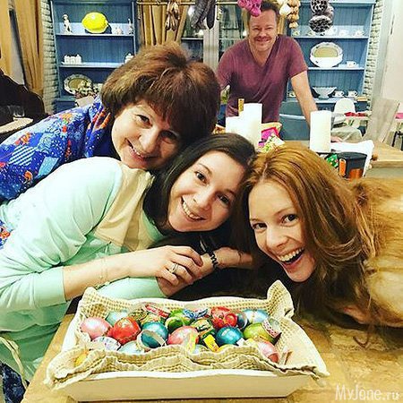 Наталья позирует с сестрой и мамой на фоне подноса с пасхальными яицами. А на втором плане улыбается Владимир Пресняков. Прекрасная фотография, душевная атмосфера!