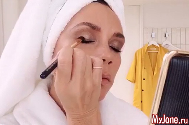 Виктория Бекхэм известна своим умением делать яркие глаза. В видео она показала, как наносит веки и прокрашивает глаза карандашом. Дизайнер также пользуется хайлайтером для подсвечивания скул и создания идеального лба и носа. Осталось немного румян.