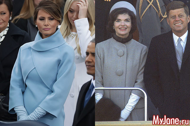Жену Дональда Трампа, вступающего сегодня в должность, уже сравнили с Жаклин Кеннеди. На церемонию присяги Мелания приехала в наряде того же цвета, что в 1961 Жаклин Кеннеди.