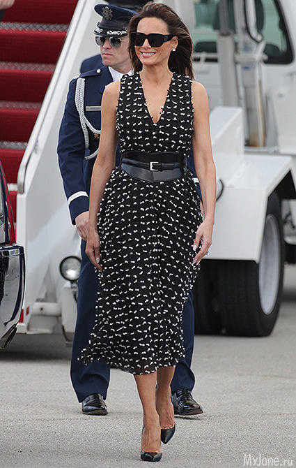 Мелания Трамп выбрала для выхода темно-синее платье, а талию подчеркнула широким ремнем Steve McQueen. Что касается обуви, то здесь хозяйка Белого дома предпочла классические лодочки Christian Louboutin.