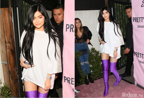 Кайли Дженнер приобрела модные сапоги-чулки в модном фиолетовом оттенке. Дополнила их блогер и фотомодель белым верхом.
