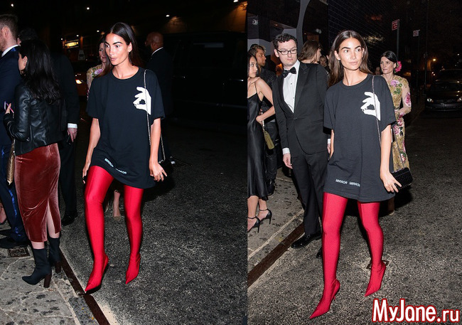 Лили Олдридж выбрала совсем другой оттенок и прибыла в модных сапогах на Met Gala 2017.