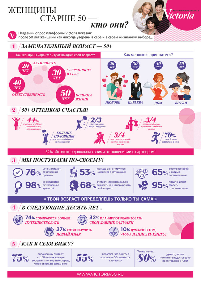 Проект Victoria отражает культурологические изменения в обществе и перемены в восприятии поколения 50+. Его задача – подчеркнуть и по достоинству оценить все преимущества нового поколения женщин в замечательном возрасте, показать им, что этим возрастом можно и нужно гордиться.