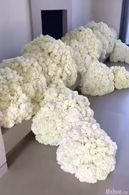 Это охапки белых цветов, которые были причудливо разложены по комнате. По словам звезды, муж часто балует ее именно белыми цветами, и часто в таком вот щедром количестве.