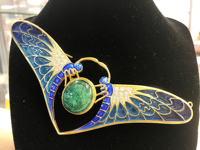В «авторской части зала» лучшие ювелиры – художники страны и ближайшего зарубежья представили экслюзивные украшения, предметы интерьера из драгоценных металлов и камней. Среди них 30 членов Союза художников России и МСХ, творческие мастерские и производители. Здесь можно было увидеть работы известнейших мастеров своего дела. Такими, например, являются постоянные наши участники известнейшие мастера-ювелиры Алла Козлова и Леонид Маслацов. Алла и Леонид являются членами Творческого союза художников России с 2010 года и лауреатами ряда конкурсов авторов-ювелиров на всероссийских ювелирных выставках таких как «JUNWEX», «Симфония самоцветов». Ряд их украшений выкуплены музеями страны и находятся в частных коллекциях. Во время прошедшей выставки «Симфония самоцветов» была организована впечатляющая экспозиция украшений этих мастеров под названием «Лотос». Художники выставили и ряд новых своих работ. Одна из них это брошь «Бабочки», которая изготовлена из серебра, позолота, витражной эмали и изумруда.