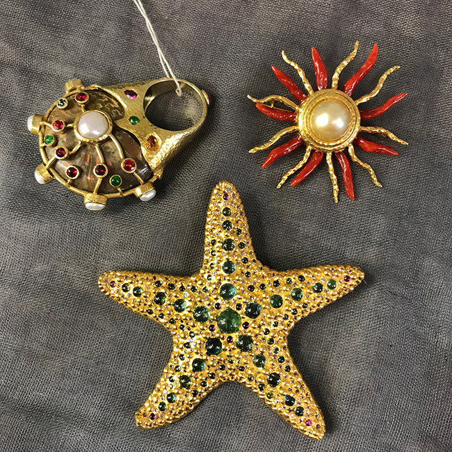 - брошь "Солнце" (серебро, позолота, морской жемчуг и кораллы).