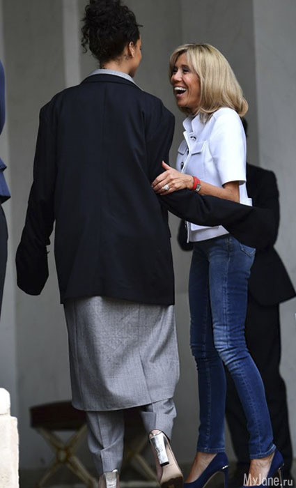 Встреча первой леди Франции и звезды поп-сцены прошла в Елисейском дворце. Детали встречи пока неизвестны. Брижит Макрон пришла на встречу в белом пиджаке и джинсах, а Рианна выбрала одновременно деловой и мешковатый костюм oversize.