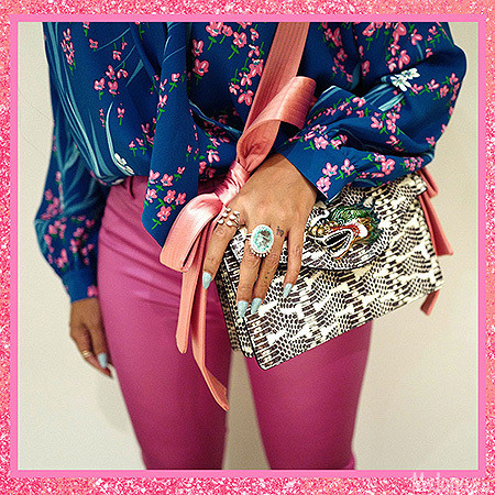 Певица надела цветочную блузу, розовые легинсы Balenciaga и дополнила их сумкой Gucci и массивными украшениями Yana от российского дизайнера Яны Расковаловой. Розовые туфли, конечно, на высокой шпильке.