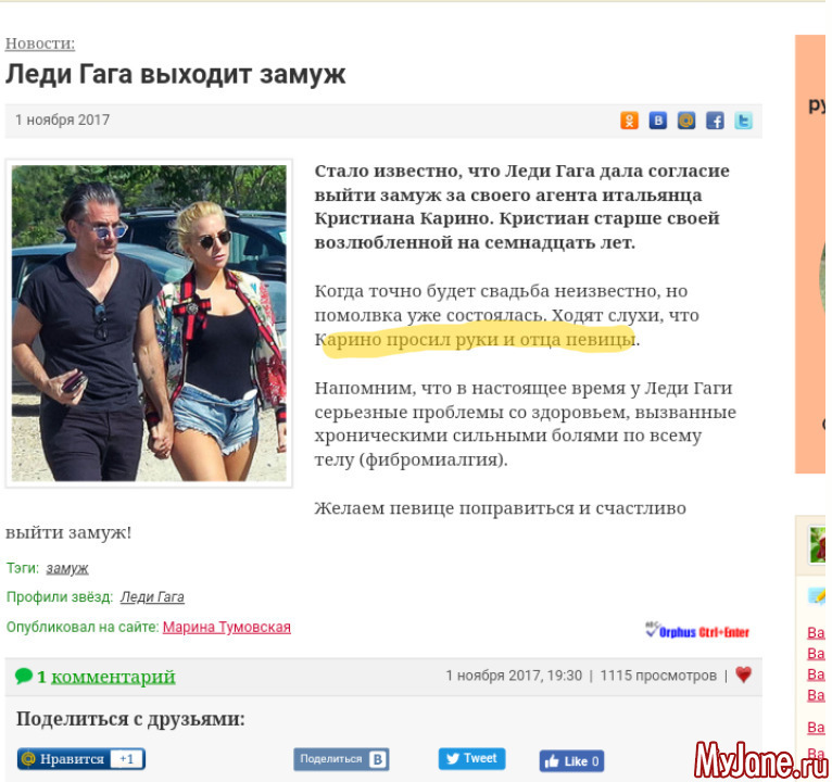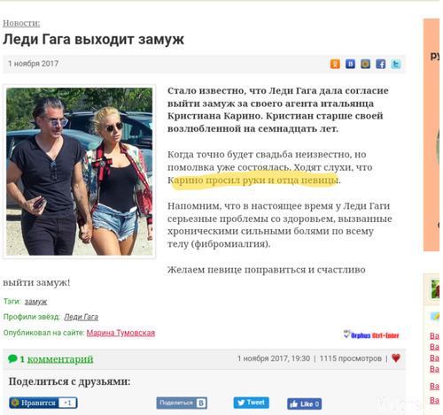 Стало известно, что Леди Гага дала согласие выйти замуж за своего агента итальянца Кристиана Карино. Кристиан старше своей возлюбленной на семнадцать лет.