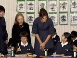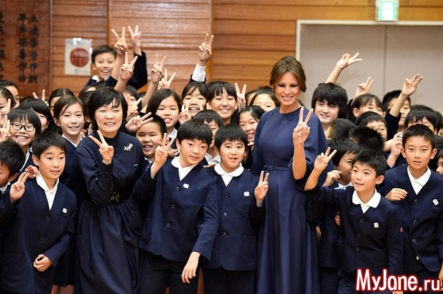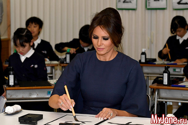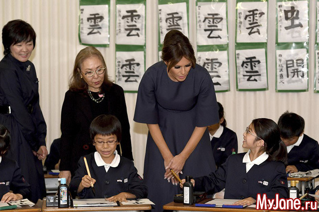 Во второй день Мелания посетила одну из школ Токио, где смогла не только встретиться с учениками, но и поучиться каллиграфии на уроке. Для этого выхода она выбрала наряд официального «школьного» цвета.