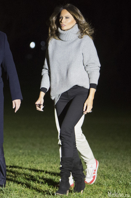 Президентская чета прилетела в Вашингтон, как водится, на частном самолете. Мелания была одета в свитер Acne Studios и сапоги Victoria Beckham. Выглядела она фантастически!
