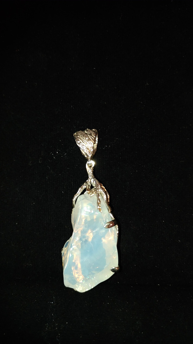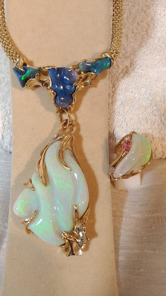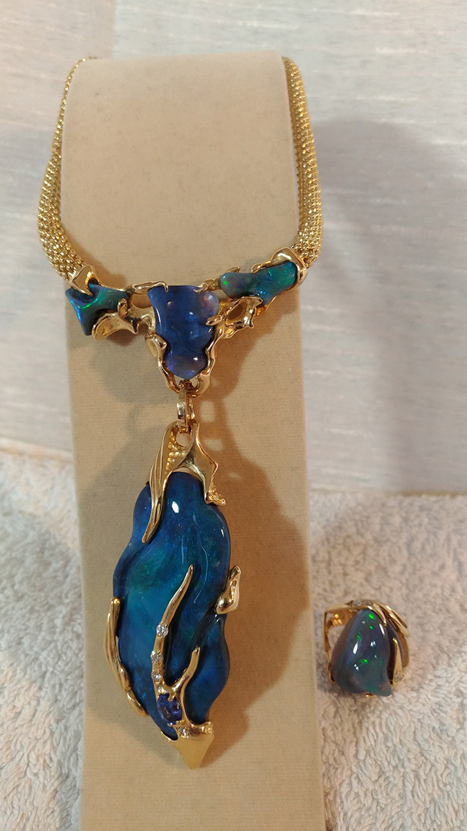 Это – уникальное украшение, состоящее из колье, двух подвесов к этому колье и двух колец, которые являются самостоятельными скульптурно-пространственными композициями. В одном подвесе необычайно изысканный и благородный австралийский опал фантазийной огранки, в сочетании с бриллиантами, который прекрасно дополняется кольцом с опалом, розовым сапфиром и бриллиантами. В другом варианте трансформера, подвес состоит из черного, благородного австралийского опала, танзанита и бриллианта и дополняется кольцом из серебра с черным опалом и бриллиантами. Несомненно, эти две композиции гармоничны и продуманны.