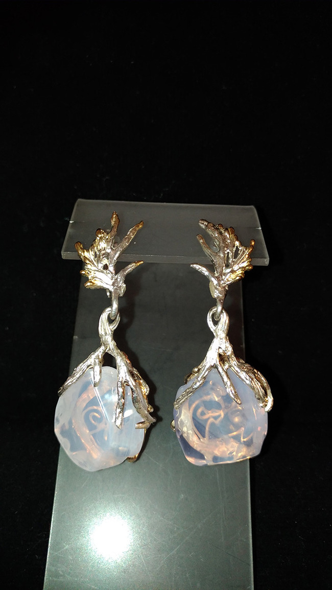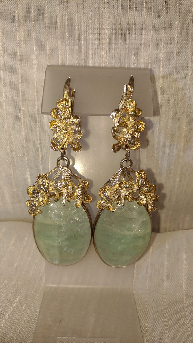 Нежные светло-зеленые бериллы в серьгах “Застывшее озеро” особенно выделяются среди других работ. Ассоциативно - образный характер этой работы раскрывается в лаконичной и простой овальной форме камня в сочетании с богатым декором из серебра.