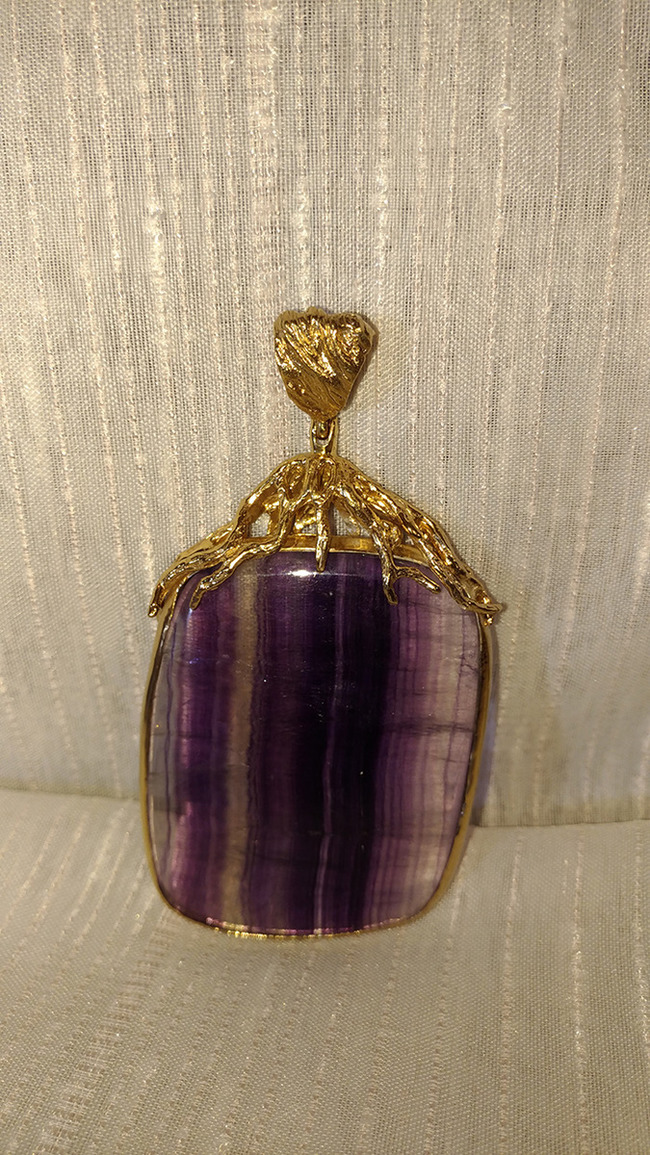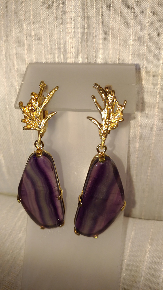 В гарнитуре “Сиреневый закат” ярким акцентом является фиолетовый флюорит и в сочетании с деликатной оправой из серебра с позолотой, создается ощущение глубины и цельности образа.