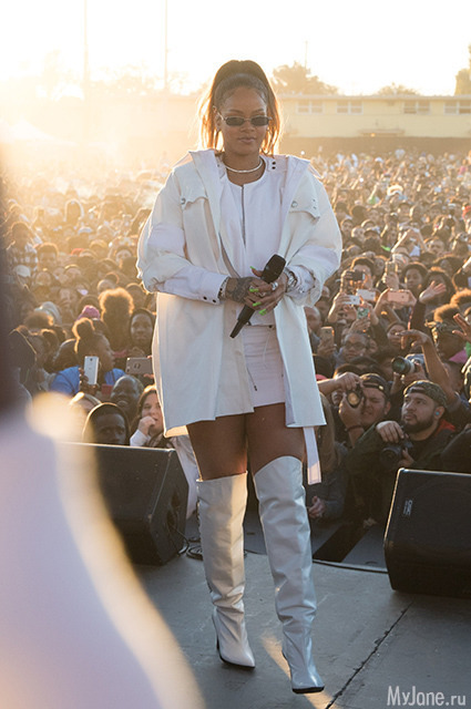 На концерт в ЛА Рианна приехала вся в белом. Даже стрелки на глазах певица решила сделать белыми.