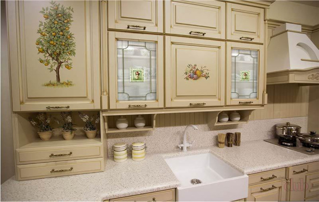 Стекло, раскрашенное вручную в витражной технике, мозаичные элементы или остатки керамической плитки (напольной или настенной) – все это может использоваться для частичного декора кухонного гарнитура. Не забывайте, что мебельный комплект воспринимается как единое целое со столешницей и рабочим фартуком на стене. Поэтому на этих поверхностях тоже можно использовать различные декоративные решения. Плитка или стеклянные элементы фиксируются на соответствующий клей.