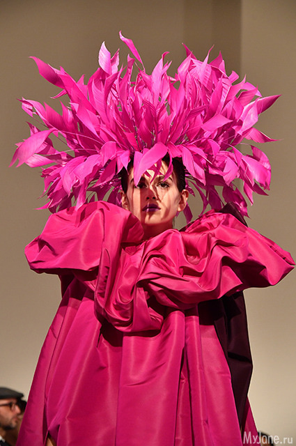 Дочь знаменитой модели вышла на подиум в наряде цвета фуксии. Не остались без внимания объемный воротник и перьевая шляпа.