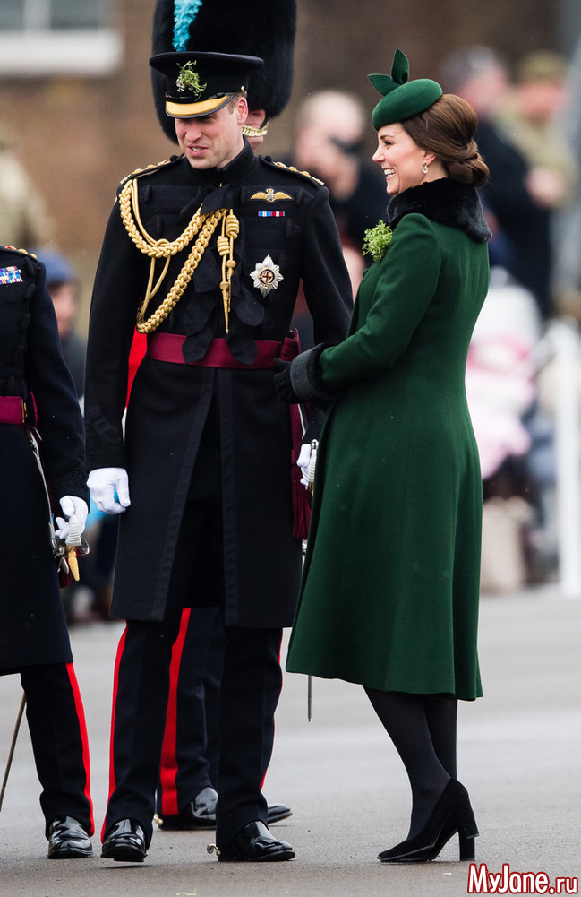 По традициям этого праздника Кэтрин оделась в зеленое. Герцогиня выбрала пальто Catherine Walker и шляпку в тон. Обувь – черные лодочки.